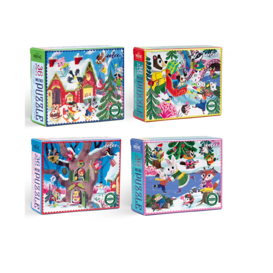 Embark on a pocket-sized adventure with this Mini 36 Piece Jigsaw Puzzles. These four mini puzzles feature fun and festive illustrations by artist Linda Bleck: Treehouse, Sleighride, Skating, and Festive House. Perfect for holiday parties, stocking stuffers, and Christmas baskets.