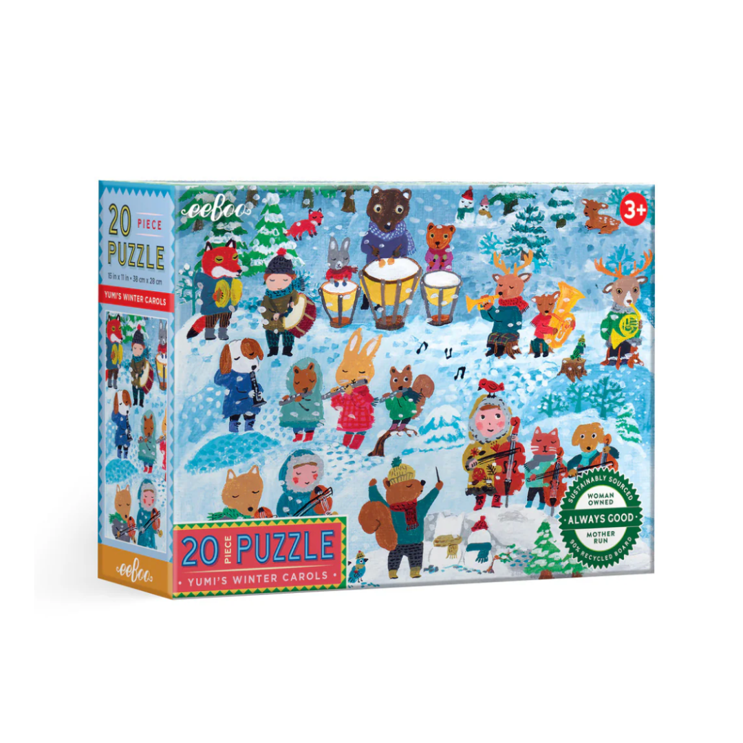 Artist Yumi Kitagishi has gathered a holiday orchestra of sweet human and animal characters to perform winter carols. This lovely puzzle image includes many instruments to identify and learn more about. Can you imagine how they all sound?